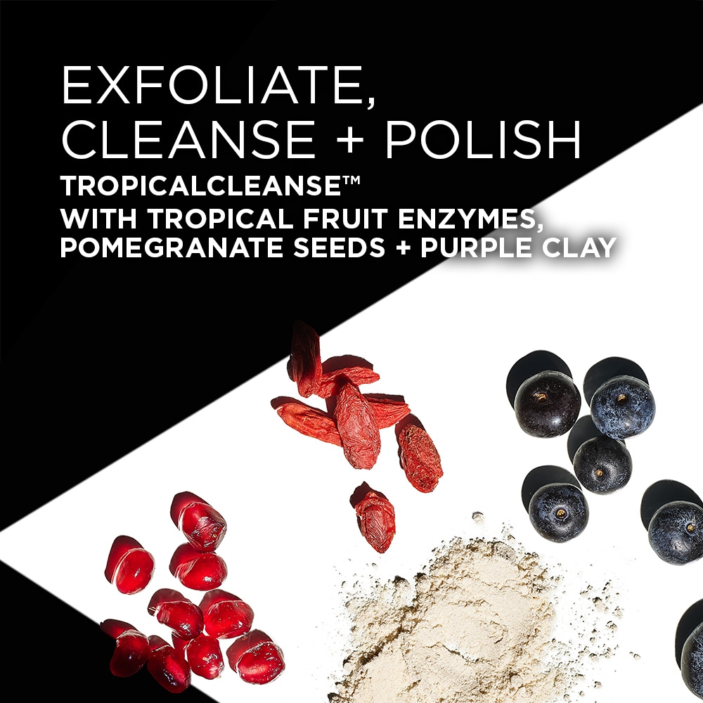 Superfruits power this exfoliating cleanser to gently polish the skin and remove impurities for a renewed glow. With a triple exfoliating blend of fruit extracts, pomegranate seeds, and tropical fruit enzymes, TROPICALCLEANSE? works to deeply cleanse and buff away dull skin cells for a renewed glow. Acai, acerola, and goji berries are combined with purple clay and TEAOXI? Green Tea Leaf to remove impurities and refresh the complexion.
